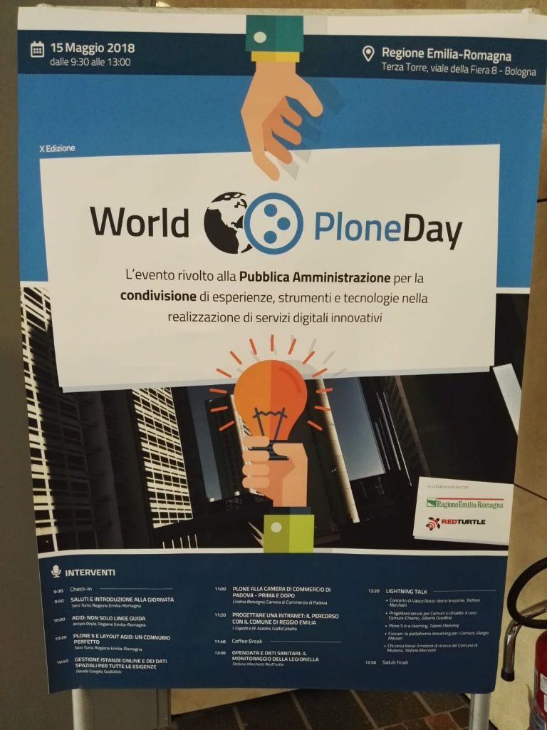 Anche quest’anno in collaborazione con Regione Emilia Romagna e RedTurtle, abbiamo partecipato al World Plone Day 2018, per confrontarci con altri circa 100 enti tra pubblici e privati, sugli utilizzi di questo potente mezzo a nostra disposizione. Plone è infatti un CMS open source molto semplice da utilizzare ad esempio per creare siti web e intranet, rende la gestione dei contenuti veloce, flessibile e personalizzabile senza dimenticare di fornire elevati standard di sicurezza. Particolare rilievo è stato attribuito agli interventi sulle linee guida AgID che sono focalizzate sull’usabilità dei siti delle pubbliche amministrazioni. Occasione perfetta per esporre la nostra personale esperienza con l’implementazione della piattaforma CiviCam sviluppata secondo questi dettami, CiviCam dialoga perfettamente con il CMS Plone permettendo integrazioni con i siti delle pubbliche amministrazioni che utilizzano questo CMS.